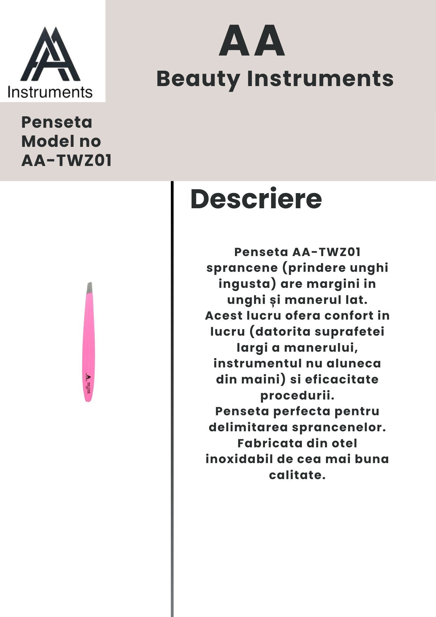 TWZ01 tweezers with a narrow angled tip and wide handle provide precise eyebrow shaping with comfort and control. Made from premium stainless steel.