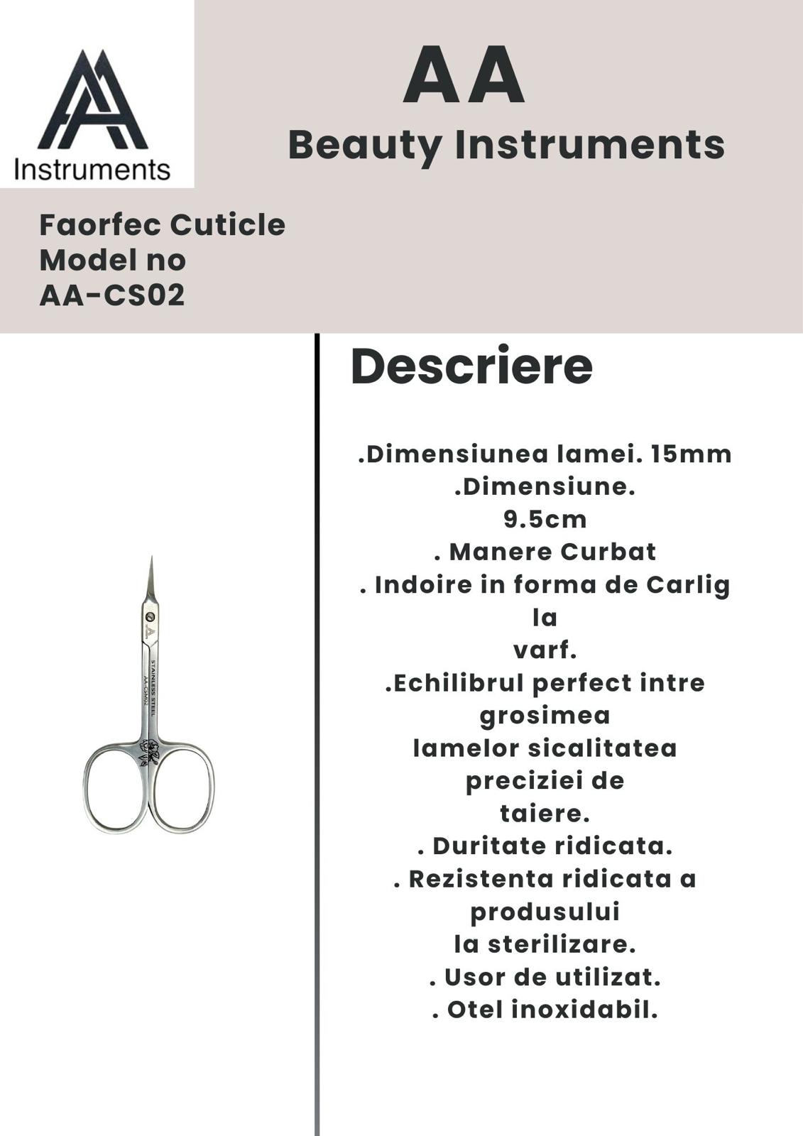 CS02 cuticle scissors are designed for accuracy and comfort. With a 15 mm blade and 9.5 cm overall length, the curved handles and hook-shaped tip provide controlled trimming in sensitive areas. Crafted from high-quality stainless steel, these scissors feature balanced blades for clean cutting, high hardness, and strong resistance to sterilization—ideal for professional manicure routines.