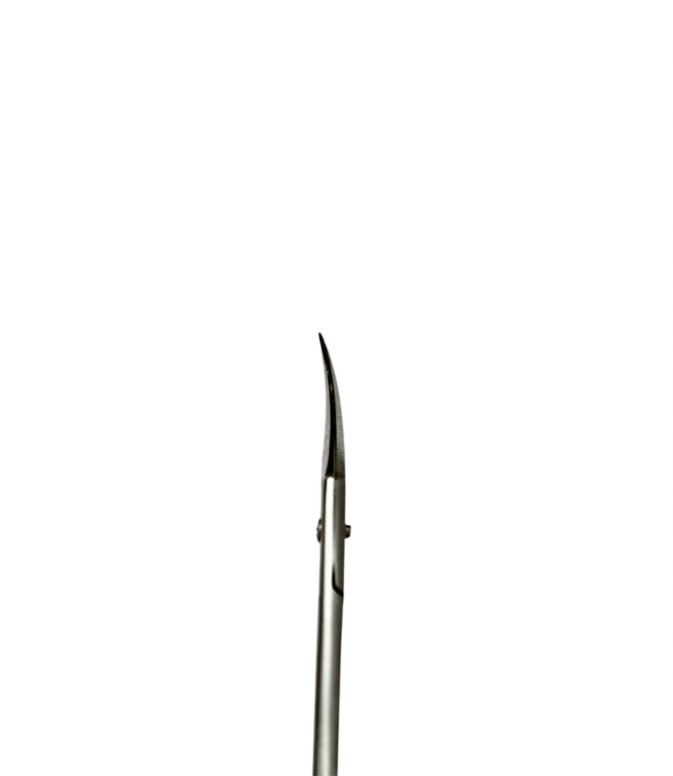 Durable stainless steel cuticle scissors with a 15 mm blade and 9.5 cm length. Ergonomic curved handles and hook-shaped tip deliver precise and safe trimming.
